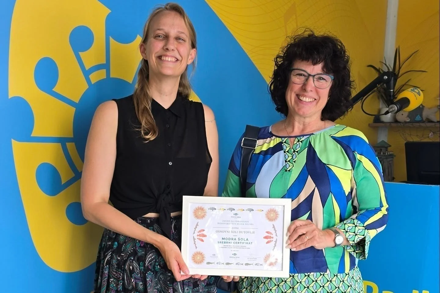 Na javljanju v živo iz mobilnega studia Radia Capris na plaži ADRIA Ankaran v okviru kampanje »Morske živali niso igrače!« smo podelili naš drugi SREBRNI CERTIFIKAT MODRE ŠOLE Osnovni šoli Dutovlje.